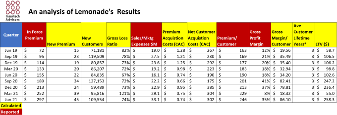 The cost of acquiring Lemonade customers is still too high to be sustainable. They attract a new customer for $302, but only earn $246 in premium for that customer in the first year. Their gross revenue of $28 million earned them $23 per customer per quarter or just under $100 per year. Simply put, they spend 3 times more on acquiring a customer than the gross revenue they generate in a year. They had a net loss of $55.6 million. For every dollar they earn, they lose two.