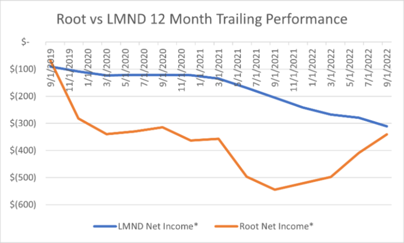 The last chart compares Lemonade’s historical 12 months trailing results with that of Root and what we see is that while Root is losing more money than Lemonade, it seems to have turned a corner and its losses are beginning to shrink. They seem to have better control of distribution and operating costs and have taken significant steps to write the ship. Only time will tell whether one of the early Insurtechs companies can transform from a technology company to a insurance company.